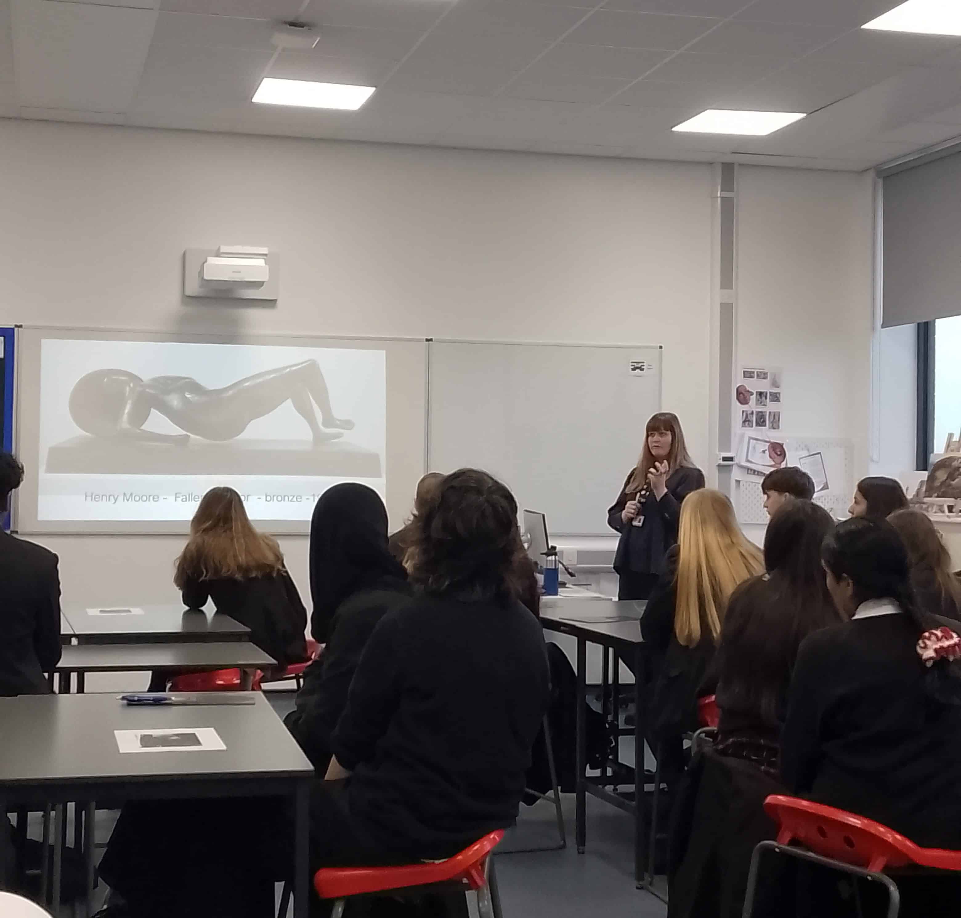 Ms Semper, History of Art A Level, showcasing Henry Moore’s “Falling Warrior” and the artist’s interest in ancient Greek sculpture while alluding to the suffering caused by the Second World War.