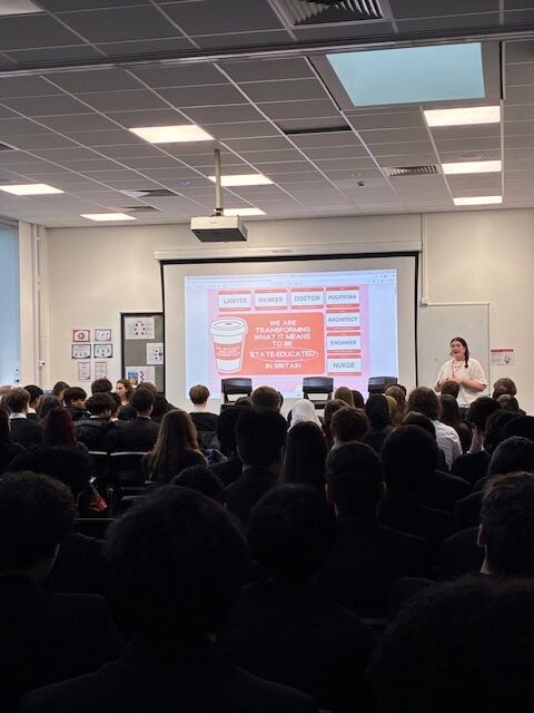Immie from 93% Club talking with students about what it means to be state-educated in the UK.